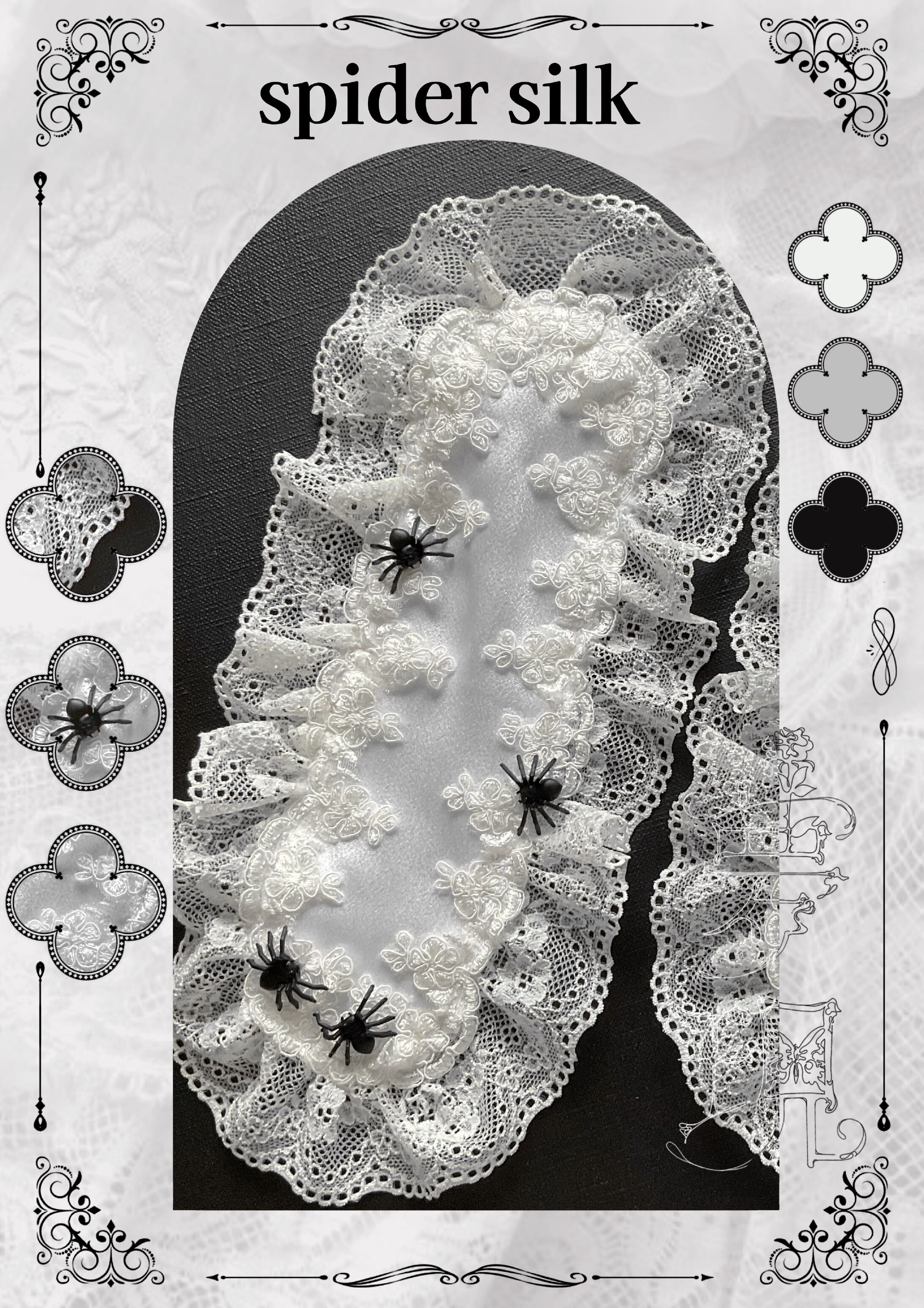 白いサテンの上に蜘蛛が1.2…4匹